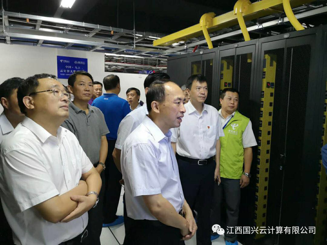 2018年8月10日下午3点,九江市市委、政法委、及市公、检、法、司等各部门主要领导,莅临九江市腾讯云计算大数据中心参观考察。在中国电信九江公司党委委书记张群和江西国兴云计算董事长段鑫陪同下,九江市委副书记、政法委书记熊永强、副市长、市公安局局长张荣先、市法院院长鄢清员、市检察院检察长熊少健,及九江开发区管委会主任叶心林一起参观了位于九江开发区的腾讯云计算大数据中心,并听取腾讯云基地投资发展运行情况的汇报。
